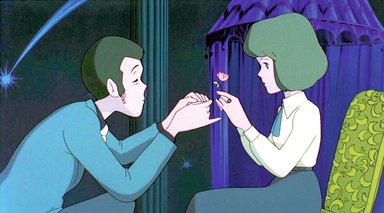Lupin and Jigen find themselves on the trail of master counterfeiters in the small European country of Cagliostro, where they quite literally must rescue a princess who has been locked in a tower by an evil Count. Packed with intricate suspense sequences as Lupin breaks into the eponymous castle and uncovers its mysteries, the film is Miyazaki's most generic in construction, with only a few of his signature peaceful moments (as the master thief charms the childlike princess, the reveal of the Castle's final mystery) and a distinct lack of abstract philosophizing. Note though that as with pretty much every other Miyazaki feature, it is the overwhelming force of nature that powers the film's conclusion. Much to the film's detriment, Jigen and eventually Goemon get almost nothing to do. Fujiko shows up for awhile too, now a short haired blonde with no apparent skills or appeal aside from a large arsenal of weaponry and a hideous camouflage jumpsuit, and has very little role in the story, though she does take control of a TV camera in homage to one of the better episodes from late in the show's run, though she ends up looking dangerously like April O'Neil, girl reporter, from the Teenage Mutant Ninja Turtles series.